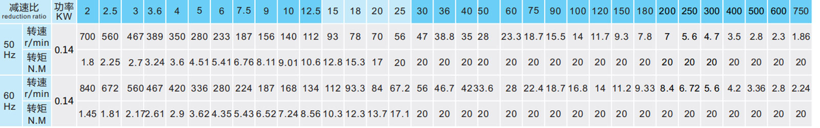 轉(zhuǎn)速是以電動(dòng)機(jī)的異步轉(zhuǎn)速(50Hz:1400r/min、60Hz:1680r/min)為基準(zhǔn)除以減速比而算 出來(lái)的數(shù)值。實(shí)際轉(zhuǎn)速將隨負(fù)載大小變化而有所變化。