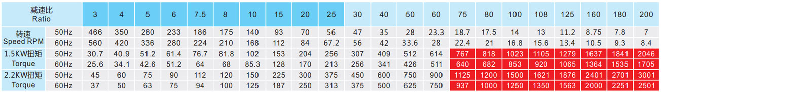 ▲ 表列轉(zhuǎn)速是基于電機異步轉(zhuǎn)速(50Hz:1400r/min、60Hz:1680r/min),額定負載時,實際轉(zhuǎn)速為表列轉(zhuǎn)速的80%-98%。