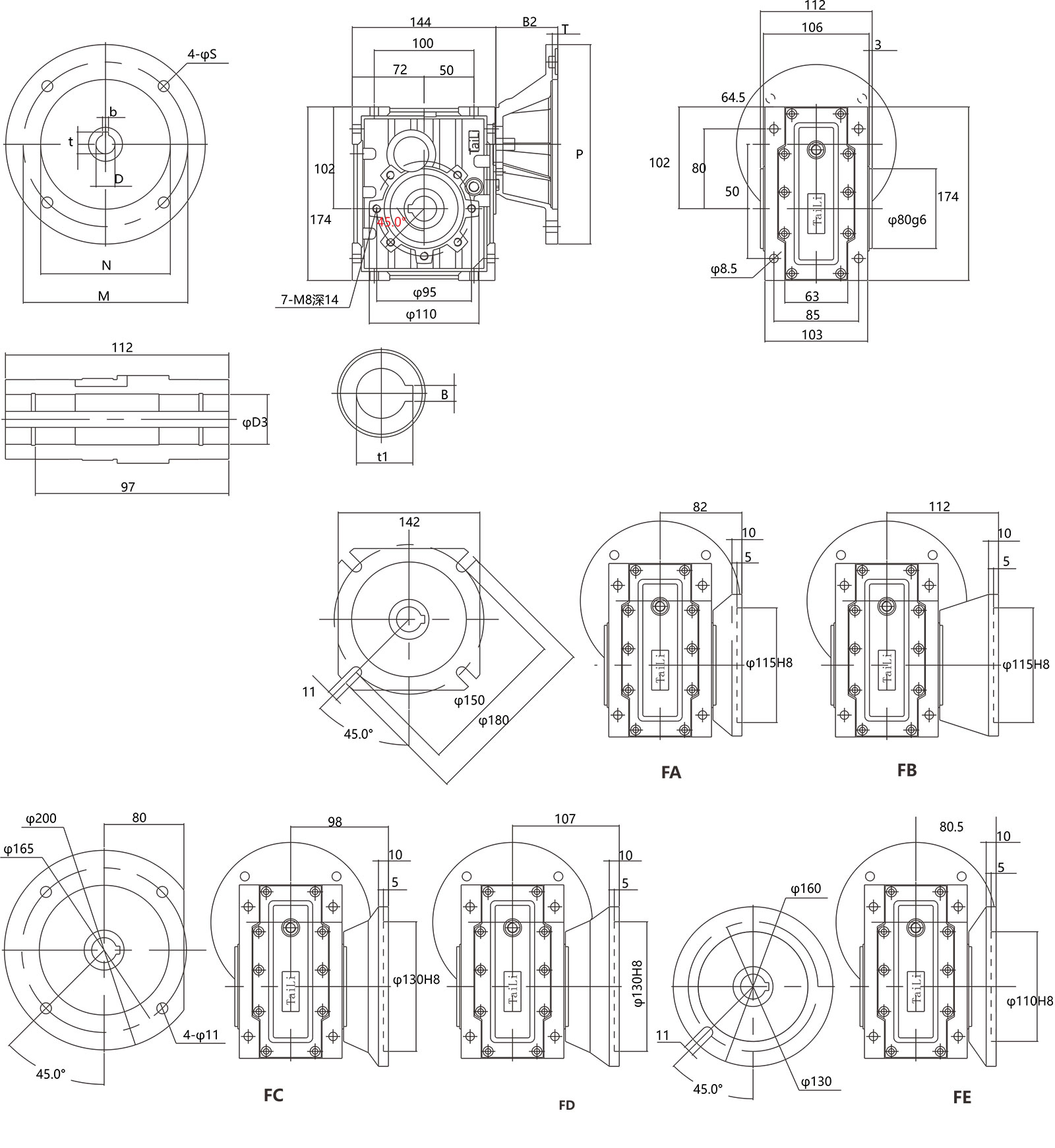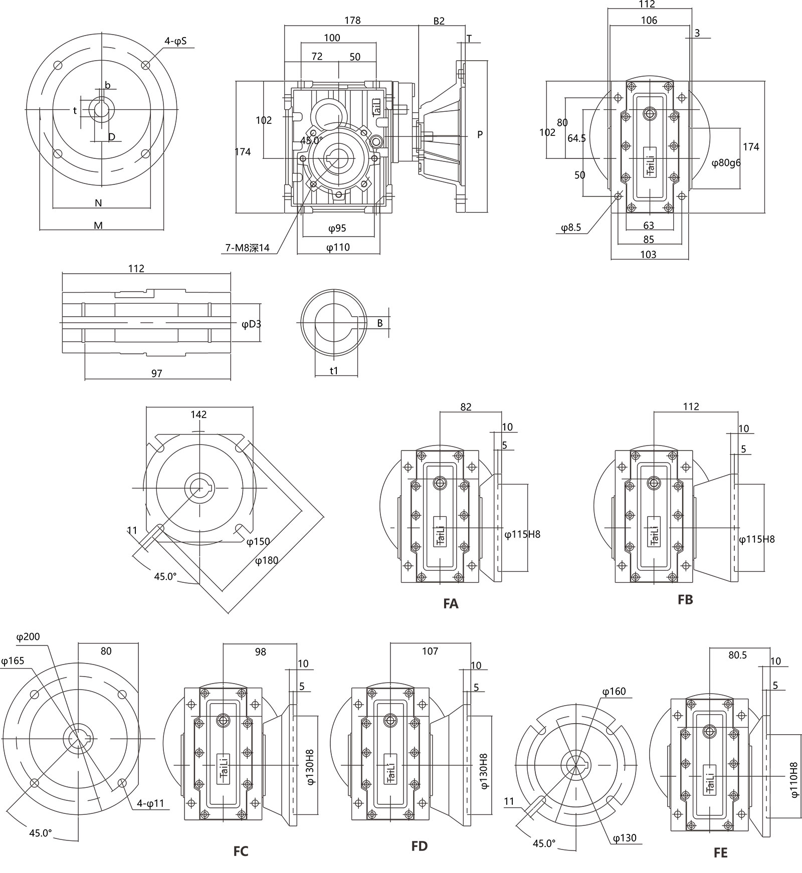 TKM系列減速 器安裝尺寸與TNRV系列渦輪蝸桿減速器完全兼容( TKM28與TNRV050部分尺寸不同) ;
